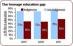 | z | In 2011, 52% of Australia Indigenous teenagers aged 15–19 were in education, when 75% of other teenagers in Australia were. The teenage education gap was 23%. | ![]() |